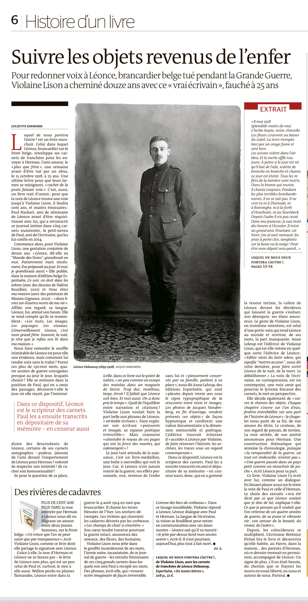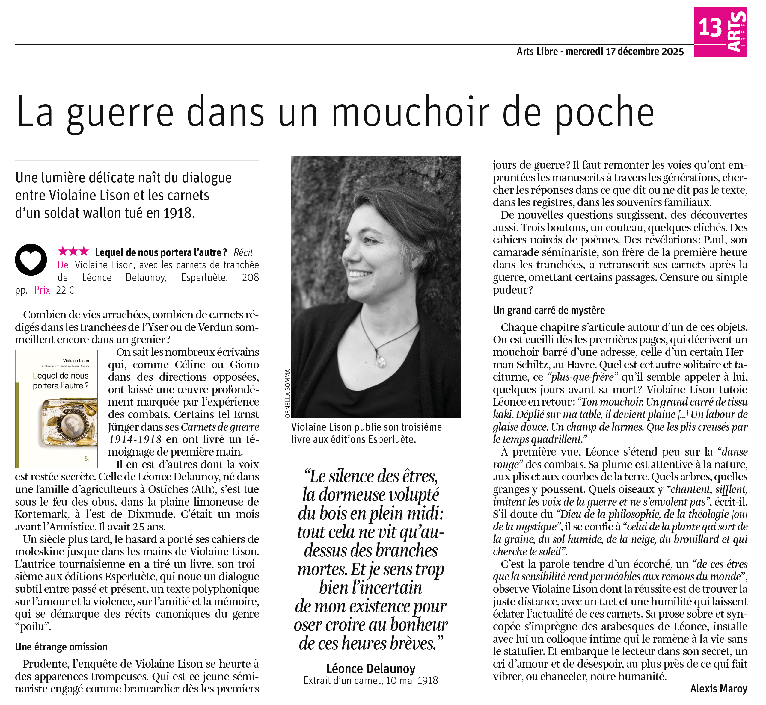 Un entretien passionnant ponctué de lectures immersives des carnets de tranchée de Léonce Delaunoy, à réécouter ici : auvio.rtbf.be