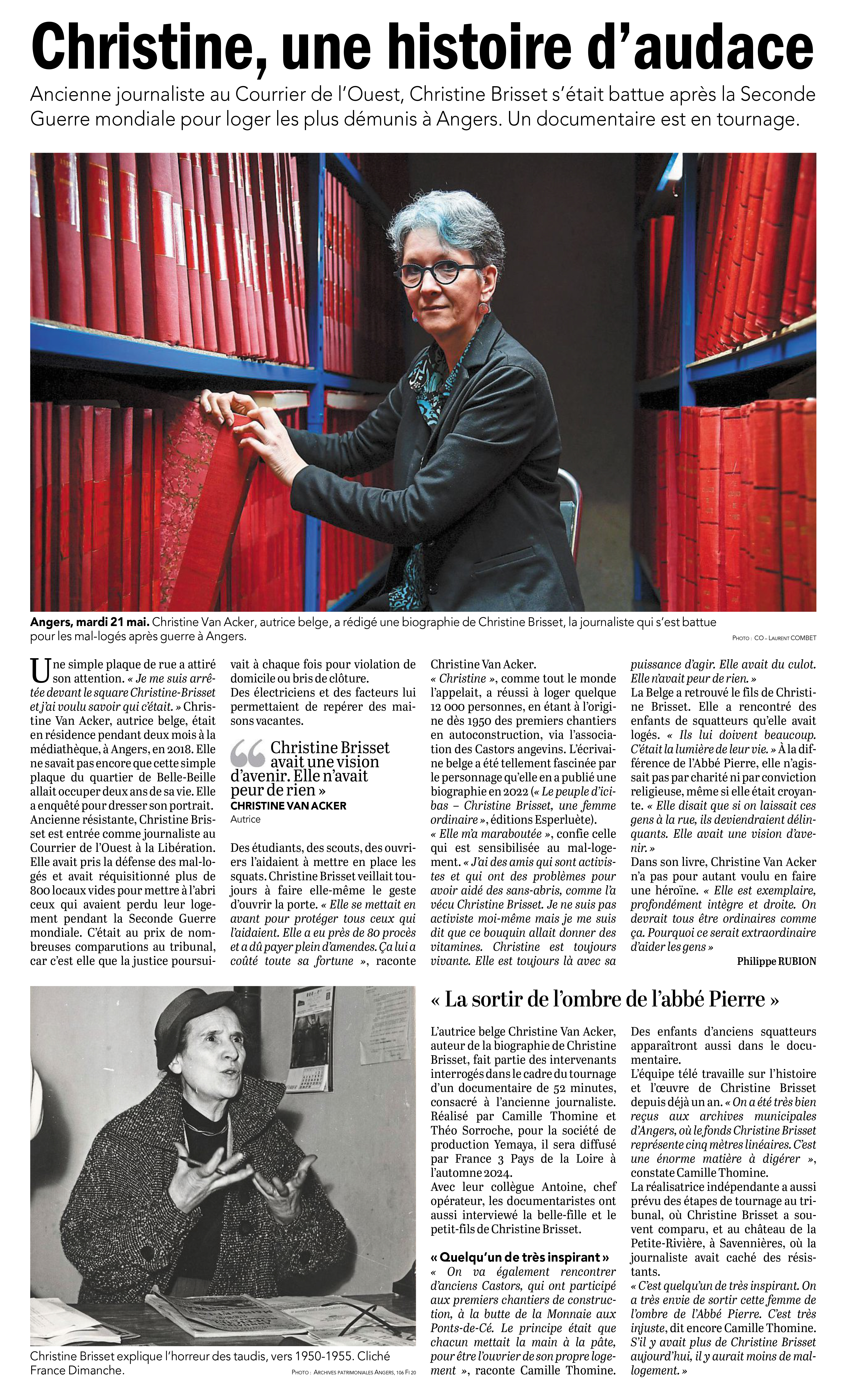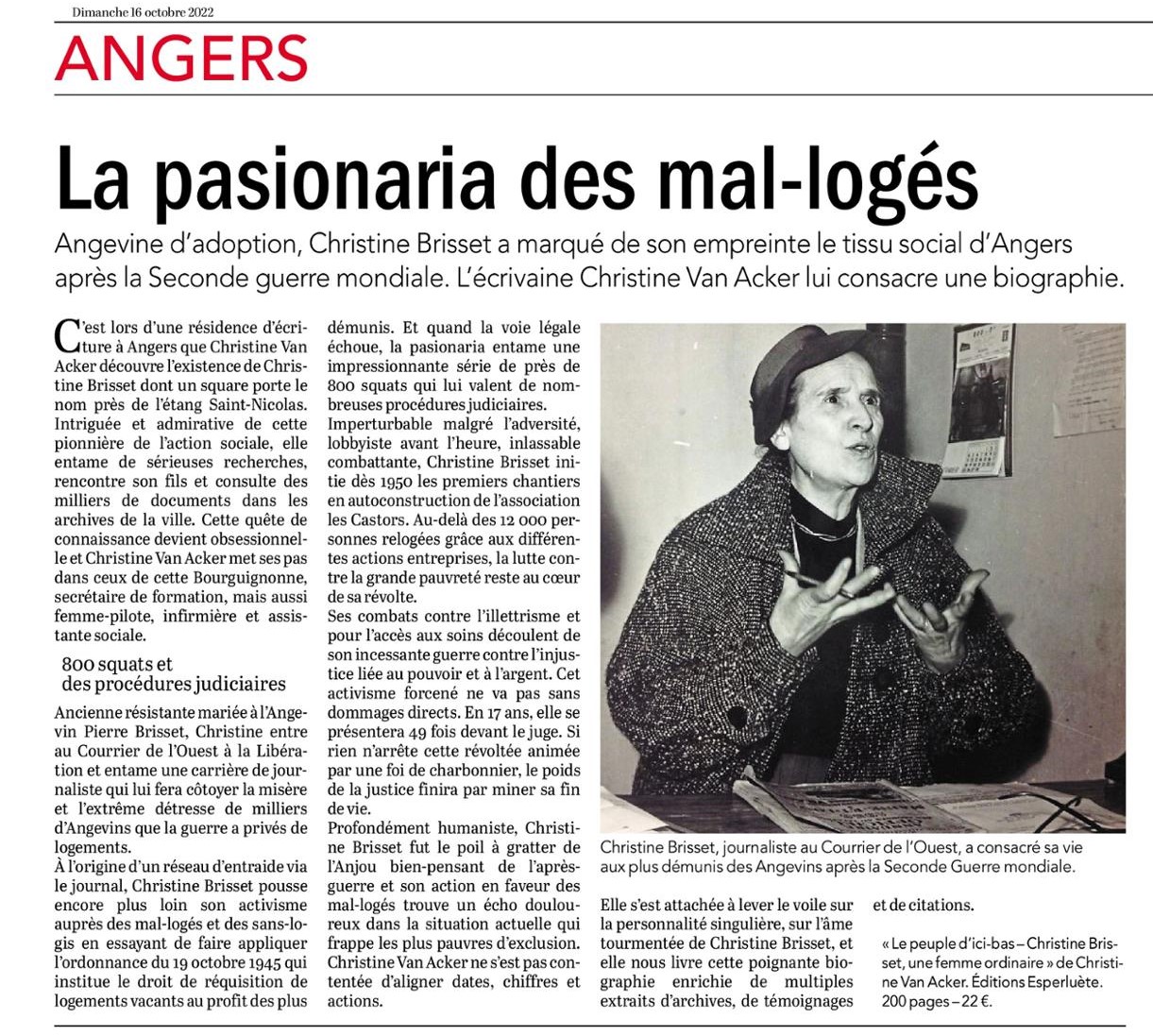 "Biographie d’une héroïne ordinaire, illustration sans hagiographie de celle qui, toute sa vie, se battit contre l’injustice, pour le droit au logement, celui à la dignité surtout dont l’autrice nous montre l’inconfortable actualité, la manière dont un tel combat, hier et peut-être davantage aujourd’hui, est condamné. Christine Van Acker retrace, par le milieu, dans ses doutes et hantises, la vie de Christine Brisset, celle qui, à Angers, inventa le squat comme réquisition de logements libres, participa au mouvement d’auto-construction des Castors, qui fut aussi celle dont on se servit, préfet et autres ministériels autorités, pour pallier à une criante absence de solution.