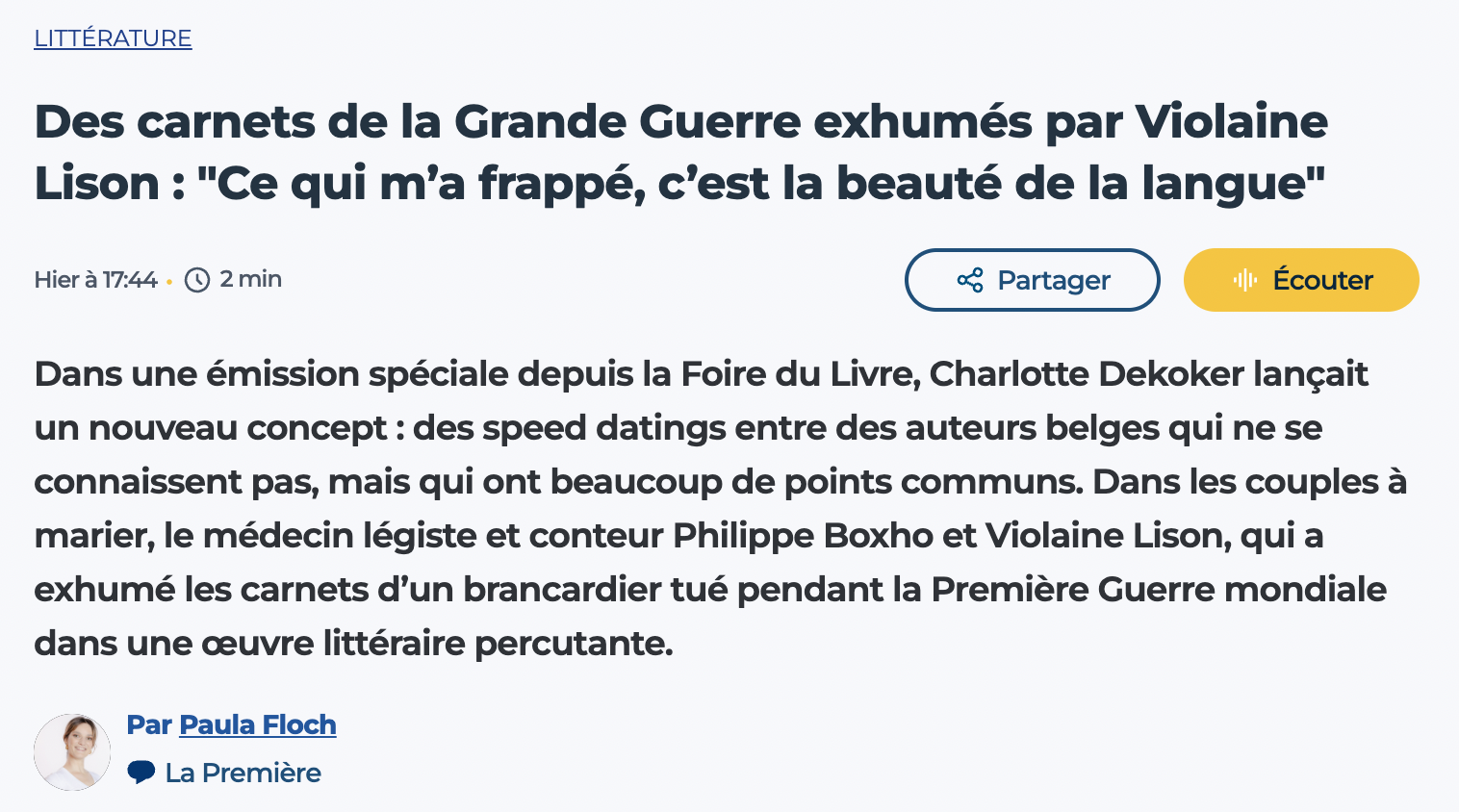 Un entretien passionnant ponctué de lectures immersives des carnets de tranchée de Léonce Delaunoy, à réécouter ici : auvio.rtbf.be