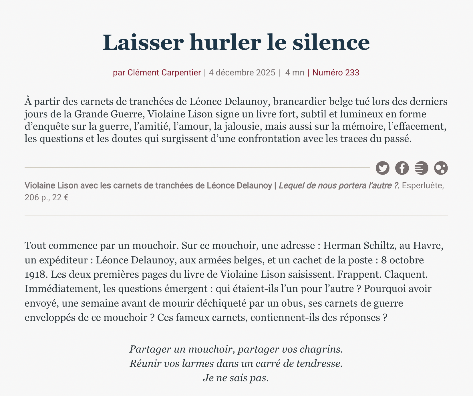 « Avec ce récit polyphonique d'une beauté sidérante, Violaine Lison fait entendre la voix d'un poète de vingt-cinq ans comme si elle traversait le siècle pour venir battre à nos tempes, et démontre que la littérature demeure le plus puissant des brancards pour porter les morts vers la lumière des vivants »